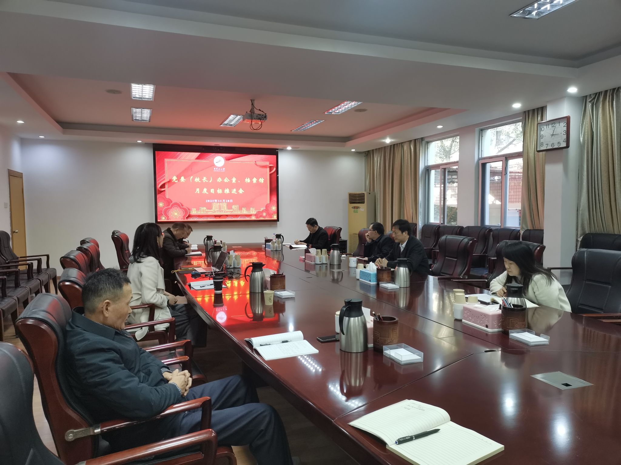 11月28日下午,党委(校长)办公室、档案馆在办公楼三楼一号会议室召开月度目标推进会,全面复盘11月份工作完成情况,统筹部署年底重点工作任务落实情况。党委(校长)办公室主任、档案馆馆长王剑主持会议,班子成员及各科室负责人参加会议。